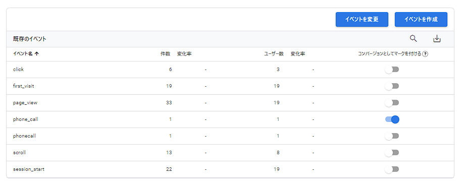 24時間ぐらいすると、GA4 のイベント一覧に「phone_call」が出てくるので「コンバージョンに設定する」をONにします。